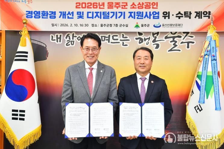 울주군은 이날 군청 소회의실에서 울산신용보증재단(산하 소상공인 행복드림센터)과 ‘2026년 울주군 소상공인 경영환경 개선 및 디지털기기 지원사업’ 추진을 위한 위·수탁 계약을 체결했다.