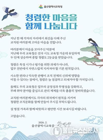 불탑뉴스신문사 차복원 기자 | 울산광역시교육청은 설 명절을 앞둔 12일 울산 지역 전 교육기관과 학교 교직원에게 청렴 의지를 다지는 ‘청렴 서한문’을 보냈다.
