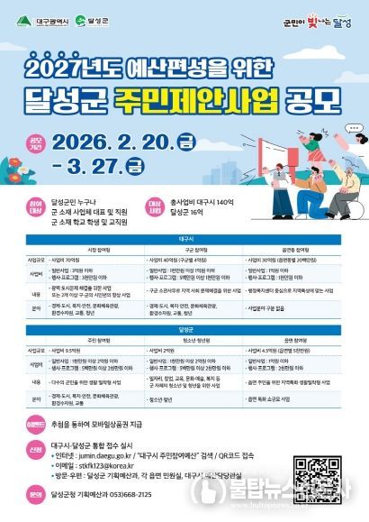 불탑뉴스신문사 차복원 기자 | 대구 달성군은 2026년 주민제안사업을 2월 20일부터 3월 27일까지 공모한다고 밝혔다.
