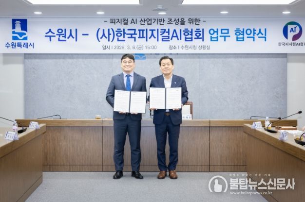 불탑뉴스신문사 송행임 기자 | 수원특례시와 (사)한국피지컬에이아이(AI)협회는 6일 시청 상황실에서 업무협약을 체결하고, 피지컬 인공지능(AI) 산업 활성화를 위해 적극적으로 협력하기로 했다.