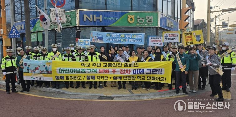 불탑뉴스신문사 한민석 기자 | 경남 밀양시는 11일 미리벌초등학교 앞 어린이보호구역에서 초등학생들의 안전한 통학환경을 조성하기 위한 교통안전문화 캠페인을 실시했다.