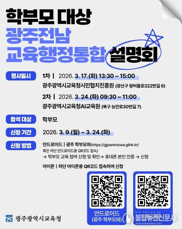 불탑뉴스신문사 차복원 기자 | 광주시교육청이 학부모의 교육행정통합 궁금증을 해소하기 위해 두 차례에 걸쳐 ‘광주·전남 교육행정통합 설명회’를 개최한다.