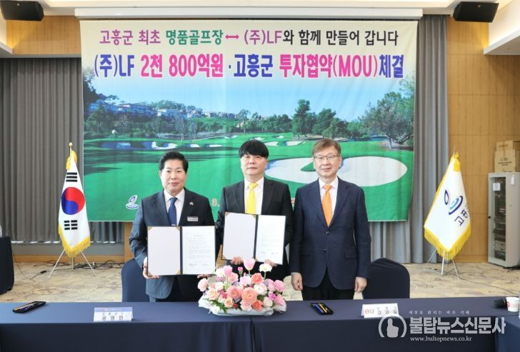 불탑뉴스신문사 송행임 기자 | 고흥군은 12일 고흥 썬밸리리조트에서 ㈜LF와 ‘고흥 신곡리 골프 · 리조트 조성사업’의 원활한 추진을 위한 투자협약(MOU)을 체결하고, 고흥군 최초의 골프장 조성사업을 본격 추진한다고 밝혔다.