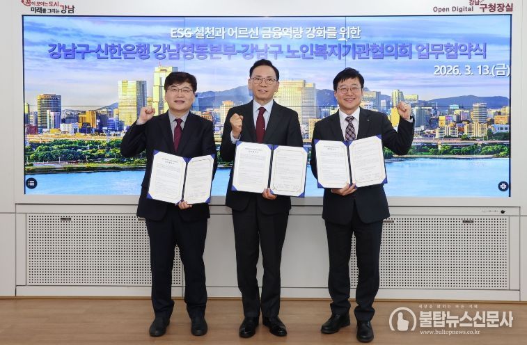 불탑뉴스신문사 차복원 기자 | 꿈이 모이는 도시, 미래를 그리는 강남구가 13일 구청에서 ㈜신한은행 강남영동본부, 강남구 노인복지기관협의회와 3자 업무협약을 체결하고 어르신 금융역량 강화 교육을 추진한다. 이번 협약은 디지털 금융환경 변화에 따른 어르신들의 금융 소외를 예방하고, 보이스피싱 등 금융사고로부터 안전한 일상을 지원하기 위해 마련됐다.