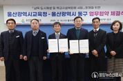 불탑뉴스신문사 차복원 기자 | 울산광역시교육청과 울산동구청은 남목 도시재생 사업에 따라 동구 남목초등학교에 조성되는 공영주차장·어울림센터를 학교와 지역이 함께 사용하는 복합 공동생활(커뮤니티) 센터로 확대 개편하기로 했다. 울산교육청과 동구청은 10일 이 같은 내용을 담은 ‘남목 도시재생 사업과 학교시설 복합화 조성을 위한 변경 협약’을 맺었다. 이번 변경 협약은 2023년 9월 합의된 150면 규모 공영주차장과 학교 밖 관사 부지 어울림센터 조성을 지역과 학교가 공동 활용하는 통합형 복합시설로 재구조화하는 내용이 핵심이다. 교육청, 지자체, 학교가 협력해 교육, 돌봄, 문화 기능을 한 공간에 구축하는 ‘학교시설복합화’ 추진 목적에 맞춰 사업이 전면 재설계됐다. 변경된 계획에 따르면 기존 지하 2층 중심의 공영주차장 계획은 지하 1층부터 지상 3층까지 총면적 5,148㎡ 규모의 복합시설로 개편되며, 2027년 12월 준공 예정이다. 조성되는 시설은 102면 규모의 공영주차장, 지역주민을 위한 1, 2층 복합 공동생활 센터, 남목초등학교 전용 3층 교육시설로 구성된다. 또한