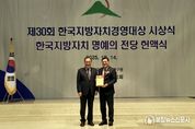 불탑뉴스신문사 차복원 기자 | 경남 합천군는 10월 14일 서울 공군호텔에서 개최된 제30회 한국지방자치경영대상 시상식에서 ‘행정혁신 부문 대상’을 수상했다. 한국지방자치경영대상은 (사)한국공공자치연구원이 주최하는 지방자치단체 경영성과 평가 시상제도다. 탁월한 성과를 거둔 지방자치단체를 모범사례로 선정해 타 지자체의 벤치마킹 대상으로 삼고, 지방자치 발전에 기여하기 위해 1996년에 제정됐다. 민간부문이 지방자치단체를 평가해 시상하는 제도 중 우리나라에서 가장 권위 있는 상으로 꼽힌다. 지방자치단체 기관상은 행정혁신, 문화관광, 복지보건, 지역개발, 산업경제(도시/농촌), 기후환경 등 6개 부문과 종합대상으로 구성된다. 수상 지자체는 2차례의 전문심사와 인터뷰 심사, 주민 만족도조사, 최종 적격심사 등 4단계의 과정을 거쳐 선정된다. 합천군은 스마트 마을방송 시스템 운영, ‘동네방네 스마트를 품은 경로당’ 구축, 농기계대여은행 AI 보이스봇 도입 등 군민이 체감할 수 있는 스마트 생활서비스를 적극 추진한 점에서 높은 평가를 받았다. 김윤철 합천군수는 “3년 연속으로 한국지방자치경영대상을 수상하게 되