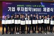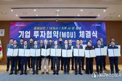 불탑뉴스신문사 차복원 기자 | 국내외 기업 투자 유치를 핵심 과제로 추진 중인 충남도가 이번엔 14개 기업으로부터 5000억 원 이상의 투자를 이끌어내며 충남의 지속 가능한 미래 발전 발판을 다졌다. 김태흠 지사는 26일 도청 대회의실에서 김석필 천안시장 권한대행 등 6개 시군 단체장 또는 부단체장, 이동주 성창오토텍 대표이사 등 14개 기업 대표와 투자협약을 체결했다. 협약에 따르면, 14개 기업은 2029년까지 6개 시군 산업단지 등 50만 64㎡의 부지에 총 5090억 원을 투자해 생산시설을 신·증설하거나 이전한다. 이들 기업이 계획대로 가동할 경우 신규 고용 창출 인원은 526명으로 예상된다. 천안 북부BIT일반산단에는 4개 기업이 생산시설을 신·증설한다. 자동차용 부품업체인 성창오토텍이 2만 3225㎡부지에 542억 원을 투자해 공장을 새롭게 만든다. 또 반도체·PCB 표면 처리 장비 전문업체인 하이쎄미코가 132억 원을 투자해 6311㎡부지에 공장을 신설하며, 산업용 로봇 제조업체 아라는 100억 원을 투자해 1100㎡부지에 생산시설을 확장한다. 수입