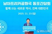 불탑뉴스신문사 차복원 기자 | 주요 20개국(G20) 정상회의 참석을 위해 남아프리카공화국을 방문한 이재명 대통령은 23일(현지시간) 양국 수교 후 최초로 동포간담회를 개최해 현지에 거주하는 동포들을 격려했다. 이번 간담회에는 동포단체 대표, 경제인, 민주평통 자문위원, 한글학교 관계자, 문화예술인 등 약 70명이 참석했다. 동포 대표로 나선 전소영 남아공 한인회장은 환영사에서 "한국과 남아공은 오랜 세월 우정과 신뢰를 쌓아온 파트너인 만큼, 대통령님의 이번 방문이 양국 관계를 굳건히 다지는 계기가 되기를 기대한다"는 소망을 전했다. 이 대통령은 격려사를 통해 "모국에서 약 1만 2000km인 삼만 리나 떨어진 남아공에서도 동포들이 주권 행사에 어려움이 없도록 전자투표 도입 등 재외선거제도 개선에 노력하겠다"라고 말했다. 또한, "재외동포 현황을 면밀히 파악하고 동포들의 활동을 본국이 적극 지원해 대한민국 국민으로서 소외되지 않고 자부심을 가질 수 있도록 최선을 다하겠다"고 격려했다. 이어 이동민 민주평통자문회의 아프리카협의회 중남부지회장의 건배사로 본격적인 오찬이 시작됐다. 이