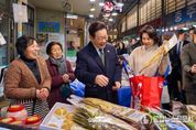 불탑뉴스신문사 차복원 기자 | 이재명 대통령과 김혜경 여사는 오늘 낮, 설 명절을 앞두고 충북 충주시에 위치한 무학시장을 찾아 지역 세밑 물가를 점검하고 상인들을 만나 현장 의견을 청취했다. 무학시장은 지난 1978년 노점상들의 정착을 위해 개설된 전통시장이며, 이번 방문은 설 민심을 청취하기 위한 민생 행보의 일환이다. 이 대통령과 김 여사는 시장 내 여러 상점을 들러 “새해 복 많이 받으세요”라며 인사를 했고, 상인과 시민들은 환호와 박수로 이 대통령 부부를 맞았다. 이 대통령 부부에게 더덕을 판매한 상인은 “덕분에 마수걸이를 한다”며 “오늘 장사가 잘될 것 같다”고 말해 웃음을 자아냈다. 다른 상인들도 “힘나게 해주셔서 감사하다”, “너무 고생 많으시다”며 인사를 전했다. 이 대통령 부부는 황태포, 시금치, 곶감과 깐밤 등 제수용품과 먹거리를 구입했고 백도라지, 마른 멸치, 배추전 등을 즉석에서 맛보기도 했다. 이 대통령 부부는 온누리상품권과 현금으로 결제했다. 김 여사가 물건을 고르는 사이 이 대통령은 상인들에게 “장사는 잘 되느냐”, “곧 설인데 어떠시냐”고 물었다. 정육점 사