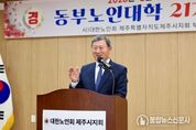 불탑뉴스신문사 한기석 기자 | 김완근 제주시장은 2월 11일 조천주민교류센터 회의실에서 열린 제21기 동부노인대학 졸업식에 참석해 축하 인사를 전했다. 이번 졸업식은 졸업생 32명과 내빈 등이 참석한 가운데 학사보고, 졸업증서 수여, 표창 수여, 축사 등의 순서로 진행됐다. 제주시 동부노인대학은 2년 과정의 교육프로그램으로, 어르신들의 삶의 질을 높이고 건강한 노후 생활을 지원하기 위해 운영되고 있다. 프로그램은 매주 화요일과 수요일 2시간씩 진행되며, 노인 교양, 건강관리, 정치·사회·시사 상식, 문화 체험 활동 등 다양한 내용으로 구성돼 있다. 김완근 제주시장은 “노인대학을 졸업하신 여러분께 진심으로 축하의 말씀을 드리고, 나이를 뛰어넘는 여러분의 열정과 도전은 우리 모두에게 큰 울림을 주고 있다”며, “병오년 새해 배움의 기쁨이 여러분의 삶의 버팀목이자 활력이 되어 언제나 건강하고 행복한 나날을 이어가시길 바란다”고 말했다.