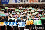 불탑뉴스신문사 차복원 기자 | 광주광역시는 12일 전남 고흥문화회관에서 ‘광주전남 행정통합 고흥군 상생토크’를 열고, 고흥군 발전 전략과 통합 이후 변화상에 대해 고흥군민들과 소통했다. 이번 행사는 여섯번째 열린 상생토크로, 통합 이후 고흥의 우주·해양·농어촌 자원을 활용해 광주·전남 균형발전을 이루기 위해 마련했다. 이날 행사에는 강기정 광주시장을 비롯해 공영민 고흥군수, 류제동 고흥군의회 의장, 고흥군민 등 600여 명이 참석해 광주전남 통합에 대한 높은 관심을 보였다. 강기정 시장은 먼저 광주전남 통합 추진상황과 향후 일정, 통합에 대한 정부 특전(인센티브) 등을 설명하며 통합 의지를 밝혔다. 강 시장은 이어 고흥군과 관련된 특별법안 특례조항으로 ▲광역생활권 지정과 교통복지 ▲항공우주 산업 육성 ▲문화관광 기반시설(인프라) 구축 지원 등을 소개했다. 특히 고흥을 비롯한 위기산업지역인 전남 동부권에 재정을 우선적으로 투입해 일자리를 지키고 광주·전남 균형발전을 이끌겠다는 구상을 발표했다. 이날 상생토크에서 공영민 고흥군수는 ▲안정적인 농어촌 재정 지원 ▲우주항공산업 육성