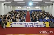 불탑뉴스신문사 차복원 기자 | 전진선 양평군수는 지난 19일 용문고등학교 소강당에서 3학년 학생 140여 명을 대상으로 ‘큰 꿈을 향한 준비가 미래를 여는 힘’을 주제로 명사 특강을 진행했다. 이번 특강은 대학수학능력시험을 마치고 졸업을 앞둔 학생들에게 진로 탐색의 방향을 제시하고, 사회로 나아가는 데 필요한 용기와 동기를 부여하고자 마련됐다. 특강에서 전 군수는 자신의 삶과 공직 경험을 토대로 목표를 향해 꾸준히 나아가는 자세의 중요성을 강조하며, 더 큰 꿈을 품고 이를 실천할 수 있는 힘을 길러야 한다고 조언했다. 또한 양평의 미래 발전 방향을 소개하며, 앞으로 학생들이 다양한 분야에서 주도적인 역할을 할 수 있도록 군이 든든한 지원군이 되겠다는 뜻을 전했다. 또한 사회 초년생이 겪을 수 있는 전세사기와 보이스피싱 피해를 예방하기 위한 실생활 안전 정보를 쉽고 명확하게 전달해 학생들의 큰 호응을 얻었다. 전진선 양평군수는 “고3이라는 치열한 시간을 지나 새로운 출발선에 선 여러분이 각자의 자리에서 밝고 힘차게 성장하길 진심으로 응원한다”고 격려의 메시지를 전했다.
