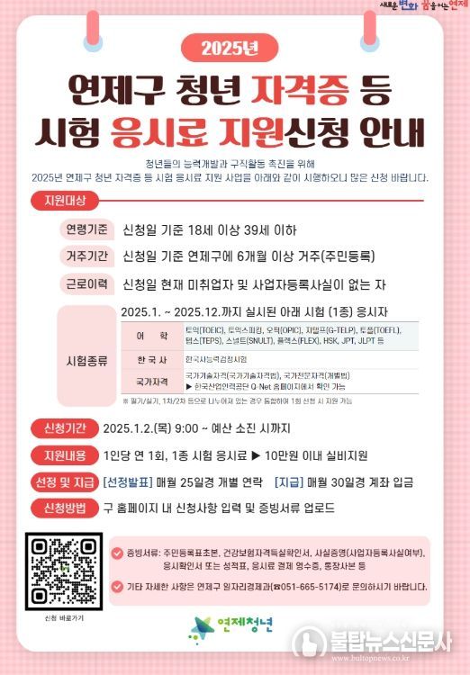 불탑뉴스신문사 송행임 기자 | 연제구는 취업 준비 청년들의 구직활동에 필요한 어학시험 및 국가자격시험 등의 응시료를 지원하는 '2025년도 청년 자격증 응시료 지원사업'을 1월부터 시행한다.