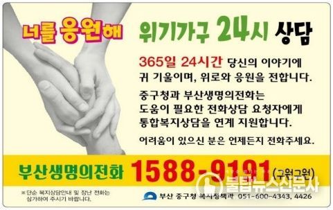 불탑뉴스신문사 송행임 기자 | 부산 중구는 올해부터‘너를 응원해, 위기가구 24시 상담창구’를 개설했다. 고립, 은둔 중인 청·중년세대를 발굴하여 지원하는 체계를 갖춘 것으로 기초자치단체로는 최초이다.