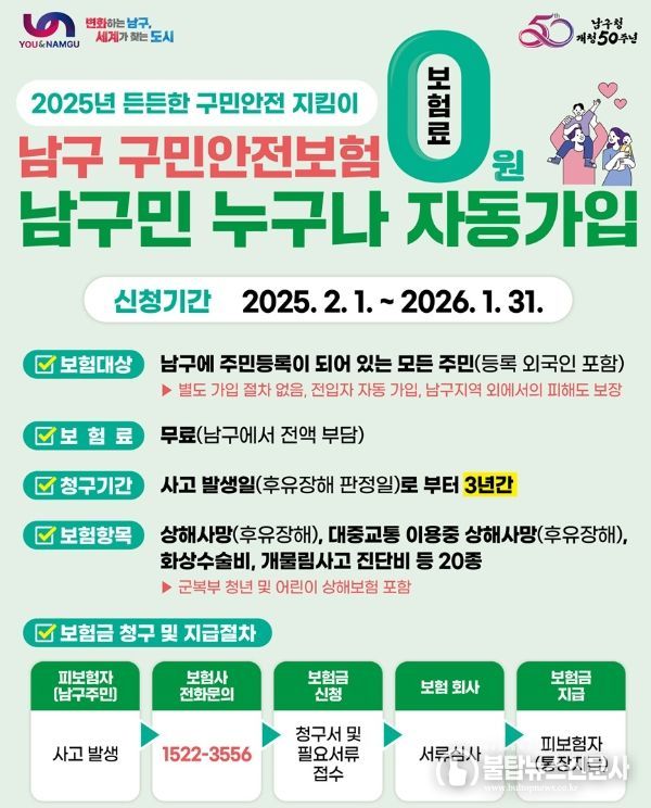 오은택 남구청장은 “올해는 남구청 개청 50주년이다. 올해를 기점으로 앞으로의 100년을 더 안전하고 행복한 남구민을 위해 구민안전보험을 더욱 강화시키고, 다양한 정책으로 남구를 발전시키도록 노력하겠다”고 밝혔다.