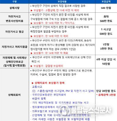 가입기간은 2025년 2월 1일부터 2026년 1월 31일까지로 개인이 가입한 보험, 부산 시민안전보험과 중복 보상이 가능하며, 사고를 당한 구민들은 사고 발생일로부터 3년 이내에 증빙서류를 갖추어 보험사에 청구하면 된다