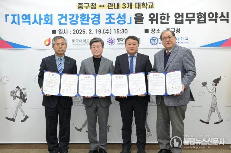불탑뉴스신문사 차복원 기자 | 서울 중구는 지난 19일, 동국대학교·숭의여자대학교·정화예술대학교 등 지역 내 3개 대학과 함께 ‘지역사회 건강환경 조성’을 위한 업무협약을 체결했다고 밝혔다.