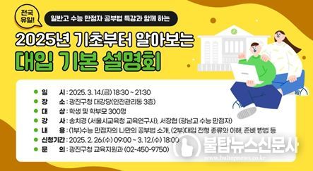 불탑뉴스신문사 차복원 기자 | 광진구가 다음 달 14일, 학생 및 학부모를 대상으로 ‘2025년 기초부터 알아보는 대입 기본 설명회’를 개최한다.