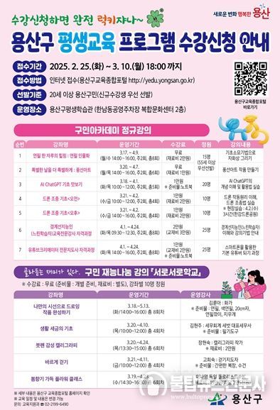 불탑뉴스신문사 차복원 기자 | 서울 용산구가 3월 10일까지 분야별 맞춤형 평생교육 프로그램 수강 신청을 받는다고 밝혔다.