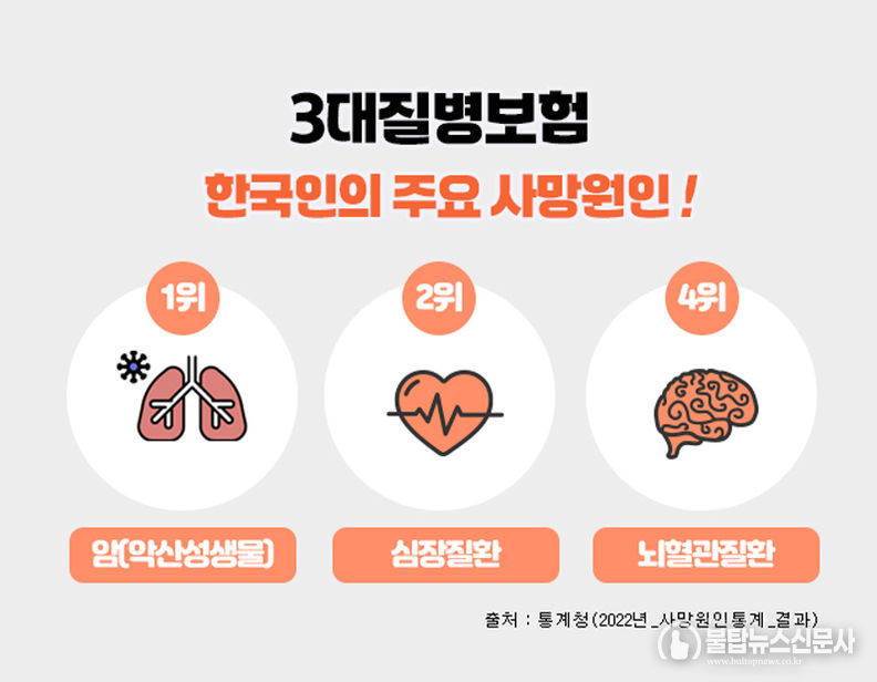 불탑뉴스신문사 차복원 기자 | 3대질병으로 일컬어지는 암, 뇌혈관질환, 심혈관질환은 한국인의 주요 사망원인에서 상위를 차지하고 있으며, 이에 대한 진단비를 집중적으로 보장해 주는 보험상품을 3대질병진단비 보험이라 할 수 있다.