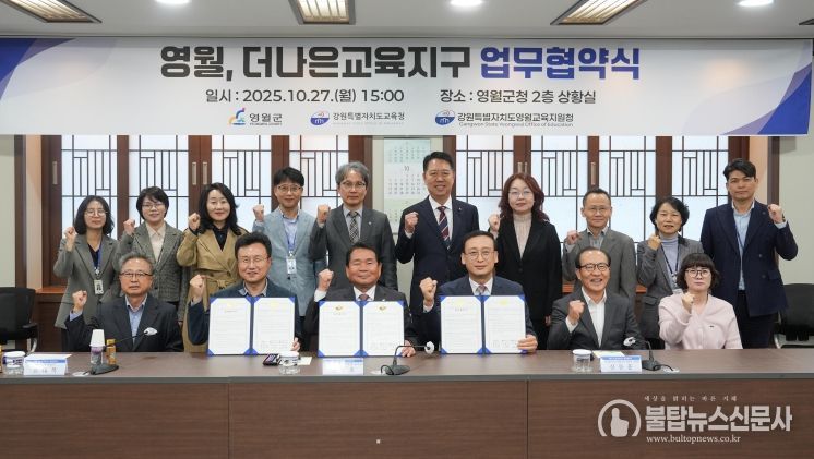 불탑뉴스신문사 차복원 기자 | 강원특별자치도교육청은 영월군청(군수 최명서), 영월교육지원청과 10월 27일 영월군청에서 ‘영월 더나은교육지구 연장지정 업무협약’을 체결했다.