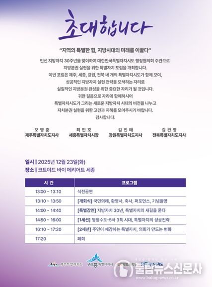 불탑뉴스신문사 차복원 기자 | 강원특별자치도는 12월 23일 코트야드 바이 메리어트 세종에서 강원, 제주, 세종, 전북 4개 특별자치시도지사들이 모여 대한민국특별자치시도 행정협의회 두 번째 정기회의를 개최했다.