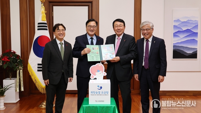 ▲우원식 국회의장이 23일(화) 오후 의장집무실에서 사회복지공동모금회에 성금을 전달하고 있다.(사진=국회사무처 사진팀)