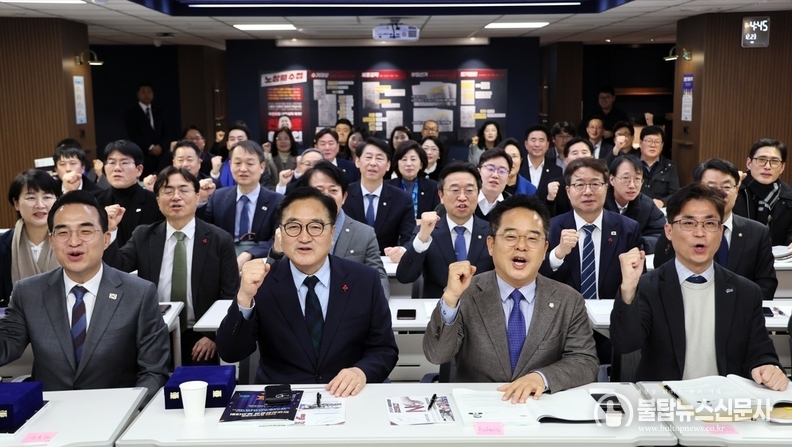 ▲23일(화) 오후 더불어민주당 당사에서 열린 '2025년도 을지로위원회 민생실천성과 보고대회' 참석자들이 기념촬영을 하고 있다.(사진=국회사무처 사진팀)