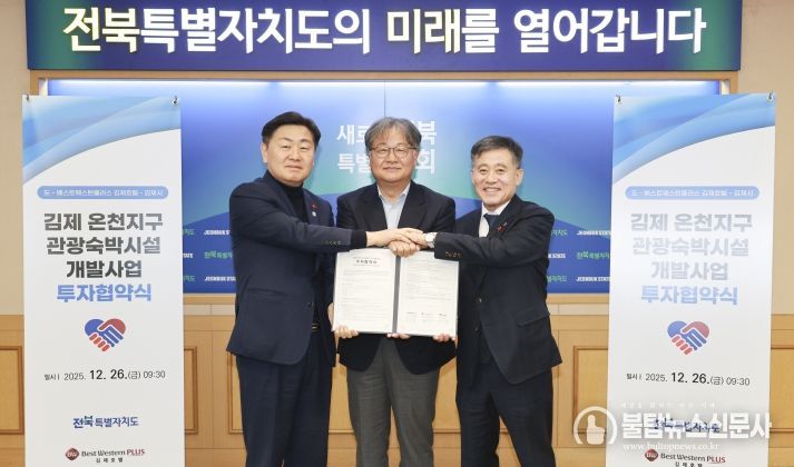 불탑뉴스신문사 송행임 기자 | 전북특별자치도가 26일 도청 회의실에서 김제시, 베스트웨스턴플러스 김제호텔과 김제 온천지구 관광숙박시설 개발사업 투자협약(MOU)을 체결했다.
