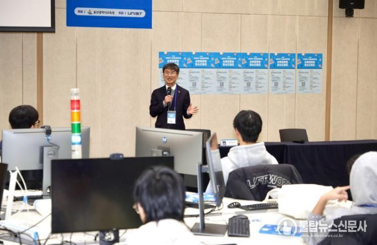 유니스트 러닝커먼즈에서 열린 이번 캠프에는 울산 지역 고등학생 90명으로 구성된 30개 팀이 참여했으며, 이론 교육과 실습, 팀 과제를 결합한 집중형 프로그램으로 운영된다.