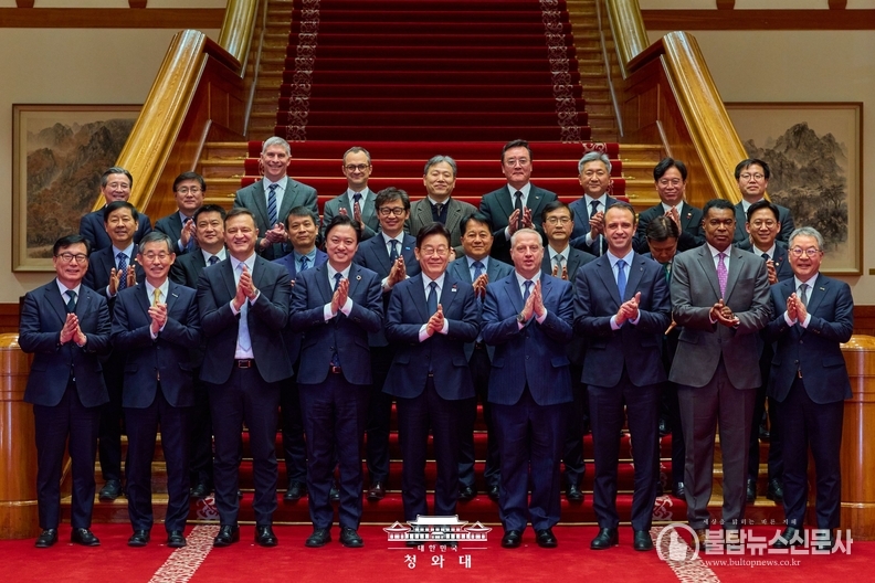 ▲이대통령 외국인투자기업 간담회후 기념촬영(사진제공=대통령실)