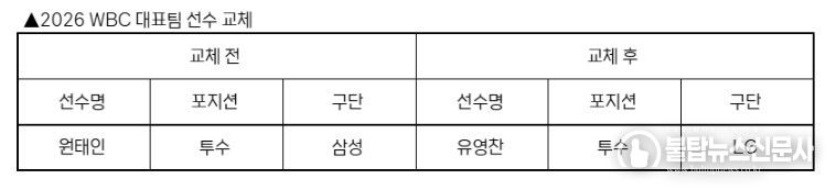 불탑뉴스신문사 한기석 기자 | KBO 전력강화위원회는 부상으로 인해 WBC 참가가 어려워진 삼성 원태인을 대체할 선수로 LG 유영찬을 확정하고 WBC 조직위에 선수 교체 승인을 요청했다.