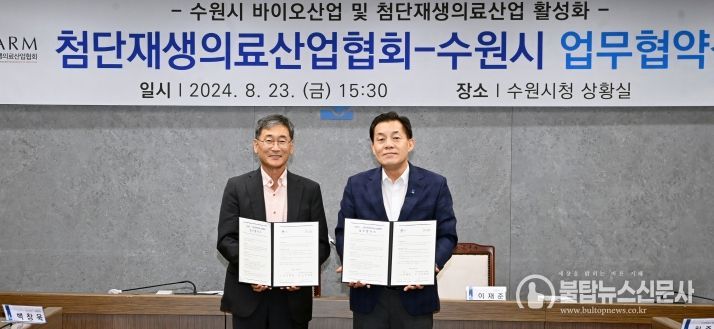 수원시와 첨단재생의료산업협회는 23일 시청 상황실에서 업무협약을 체결하고 협력을 약속했다. 협약식에는 이재준 수원시장과, 첨단재생의료산업협회 이득주 회장 등이 참석했다.