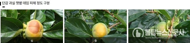 특히, 단감을 중심으로 폭염으로 인한 뜨거운 햇살에 햇볕데임(일소) 피해가 발생하여 과원 생육에 악영향을 주고 있다. 햇볕데임(일소) 피해는 과수에 수분이 부족했을 때 발생하기 쉬운 만큼 과수원 토양이 마르지 않도록 물을 충분히 공급하고 나뭇가지를 과실 쪽으로 끌어당겨 직사광선에 노출되는 부위를 최소화해야 한다.