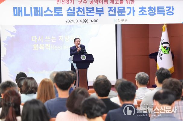 불탑뉴스신문사 송행임 기자 | 함안군은 4일 군청 3층 대회의실에서 조근제 함안군수를 비롯한 공약담당 등 90여 명을 대상으로 민선8기 군수 공약사업 이행률 향상을 위한 매니페스토 전문가 초청 특강을 개최했다.