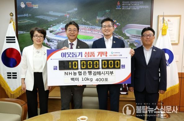 불탑뉴스신문사 송행임 기자 | NH농협 김해시지부에서 지난 4일 김해시를 방문하여 관내 경로당에 전달해 달라며 백미 10kg 400포(1,000만원 상당)를 기탁했다.