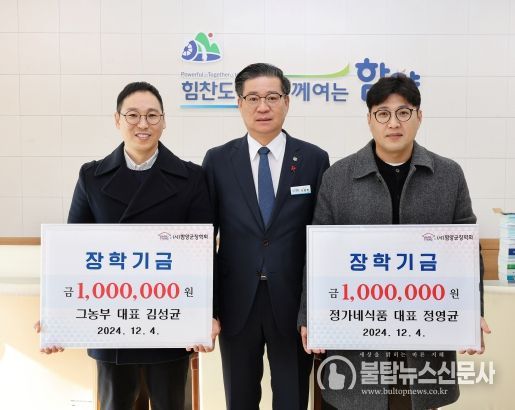 불탑뉴스신문사 송행임 기자 | 함양군 내 지역 인재 육성을 위한 장학금 기탁 행렬이 이어지고 있는 가운데 4일, ‘그농부’ 김성균 대표와 ‘정가네식품’ 정영균 대표가 함양군장학회에 장학금 100만 원을 각각 기탁하며 지역사랑을 실천했다.
