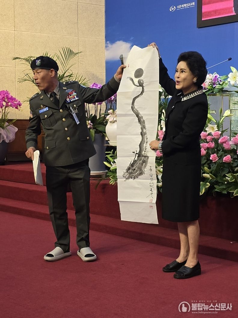예술문화 사령관 김경호 화백은 신현옥 목사에게 축하로 그림 한 점을 축하 선물로 전했다.