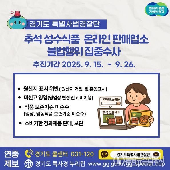 불탑뉴스신문사 차복원 기자 | 경기도는 9월 15일부터 26일까지 추석 명절을 앞두고 성수식품 온라인 판매업소 360곳을 집중 수사한다고 밝혔다.