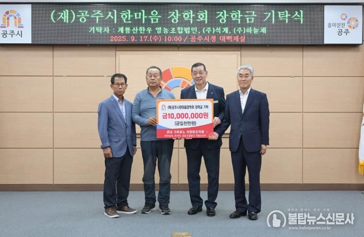 불탑뉴스신문사 차복원 기자 | 공주시 관내에서 가축분뇨 자원화 사업을 운영 중인 농업법인 3개소가 지난 17일 (재)공주시한마음장학회에 총 1천만 원의 장학금을 기탁했다.