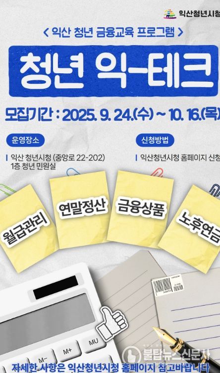 익산시는 오는 10월 21일부터 12월 16일까지 청년 맞춤형 금융교육 '청년 익테크'를 진행한다고 23일 밝혔다.