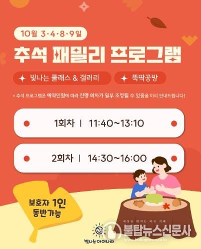 연휴 특별 가족 프로그램은 ‘가을 단풍 숲 작은 음악회’를 주제로 3·4·8·9일 진행하며 ▲빛나는 클래스&빛의 갤러리 ▲동화공작소 ▲뚝딱공방 ▲물감공방 등을 체험할 수 있다.
