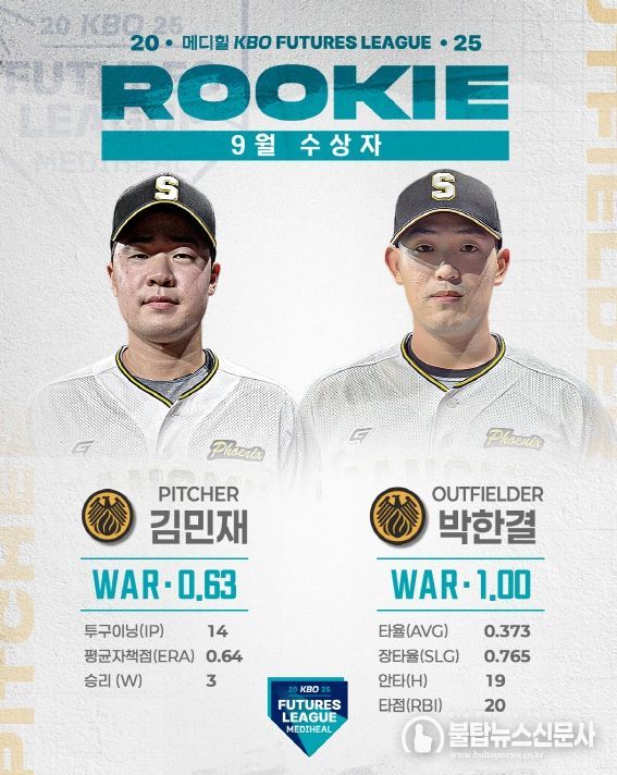 불탑뉴스신문사 한기석 기자 | 2025 메디힐 KBO 퓨처스리그의 9월 퓨처스 루키상 수상자로 투수 부문에는 상무 김민재가 WAR 0.63, 타자 부문에는 상무 박한결이 WAR 1.00을 기록하며 각각 선정됐다.