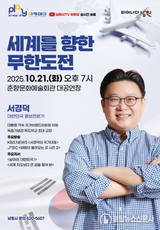 불탑뉴스신문사 차복원 기자 | 남원시는 오는 21일 오후 7시, 춘향문화예술회관 대공연장에서 대한민국 홍보 전문가 서경덕 교수를 초청해 “세계를 향한 무한도전”이라는 주제로 플레이(Play) 남원 아카데미를 개최한다.
