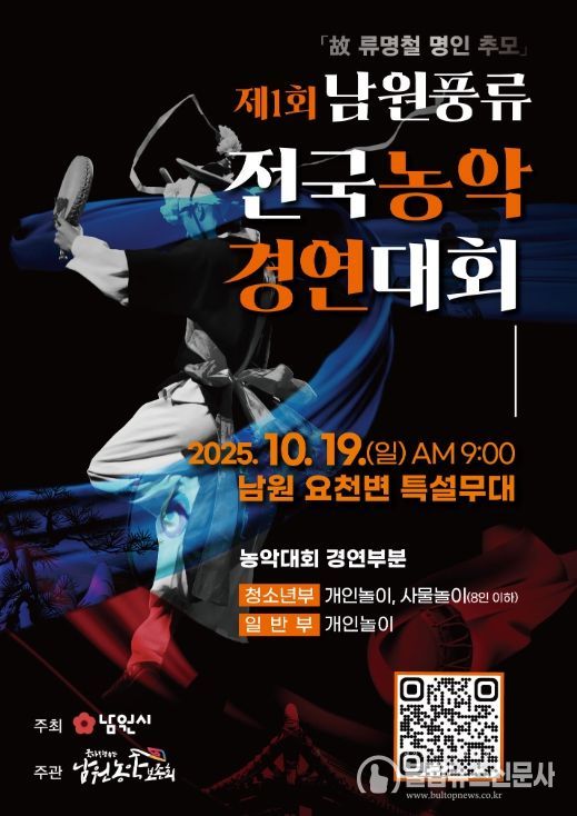 불탑뉴스신문사 차복원 기자 | 고(故) 류명철 명인을 추모하고 남원농악의 전통을 전국적으로 확산하기 위한 ‘제1회 남원풍류 전국농악경연대회’가 오는 10월 19일, 남원시 요천변 특설무대에서 열린다.