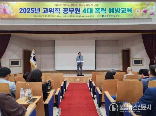 불탑뉴스신문사 차복원 기자 | 광주시교육청은 16일 교육연수원 중강당에서 5급 이상 공무원을 대상으로 ‘4대 폭력(성희롱·성매매·성폭력·가정폭력) 예방교육’을 실시했다.