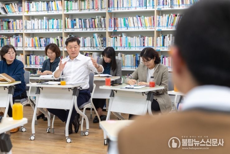 이후 도서관 ‘글사랑실’에서 열린 간담회에서는 1~2학년 학생 6명이 참여해 ‘시장님과 함께하는 충현중 이야기’를 주제로 학교의 생태활동과 공간디자인 프로젝트를 발표했다.