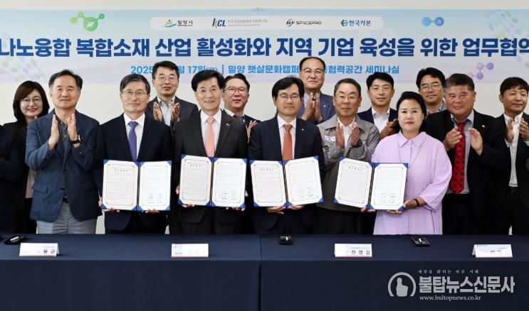 불탑뉴스신문사 한민석 기자 | 경남 밀양시는 17일 햇살문화캠퍼스 소통협력공간 세미나실에서 한국건설생활환경시험연구원, (주)스페이스프로, (주)한국카본과 나노융합 복합소재 산업 활성화 및 지역기업 육성을 위한 업무협약을 체결했다고 밝혔다.