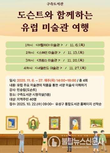 불탑뉴스신문사 차복원 기자 | 대전 유성구는 11월 6일부터 27일까지 매주 목요일 구즉도서관에서 ‘도슨트와 함께하는 유럽 미술관 여행’ 강연을 개최한다.
