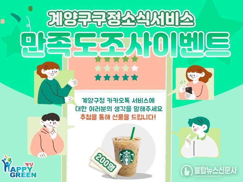 불탑뉴스신문사 차복원 기자 | 인천광역시 계양구는 10월 22일부터 11월 5일까지 15일간 구정소식지 ‘계양산메아리’와 계양구청 카카오톡 채널에 대한 만족도 조사를 실시한다고 밝혔다.